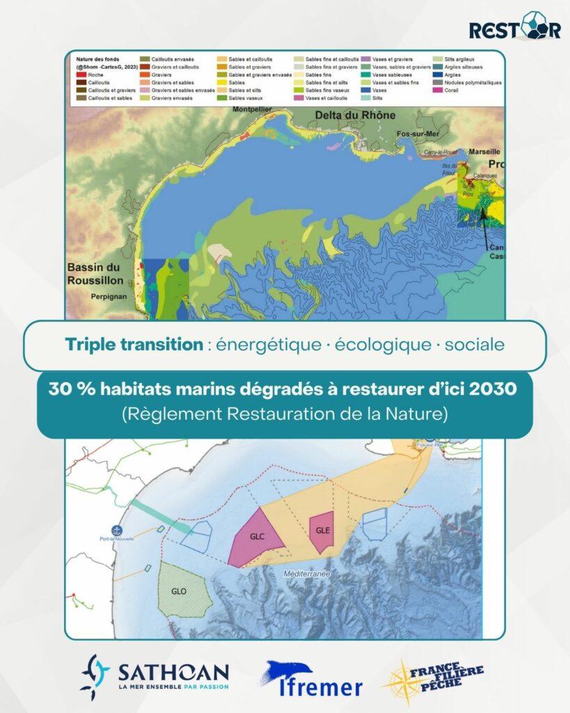 Sur la façade méditerranéenne français, la triple transition énergétique, écologique et sociale redessine les usages en mer : éolien flottant, restauration obligatoire des habitats marins dégradés (30 % d’ici 2030) et réorganisation des flottes en conséquence.